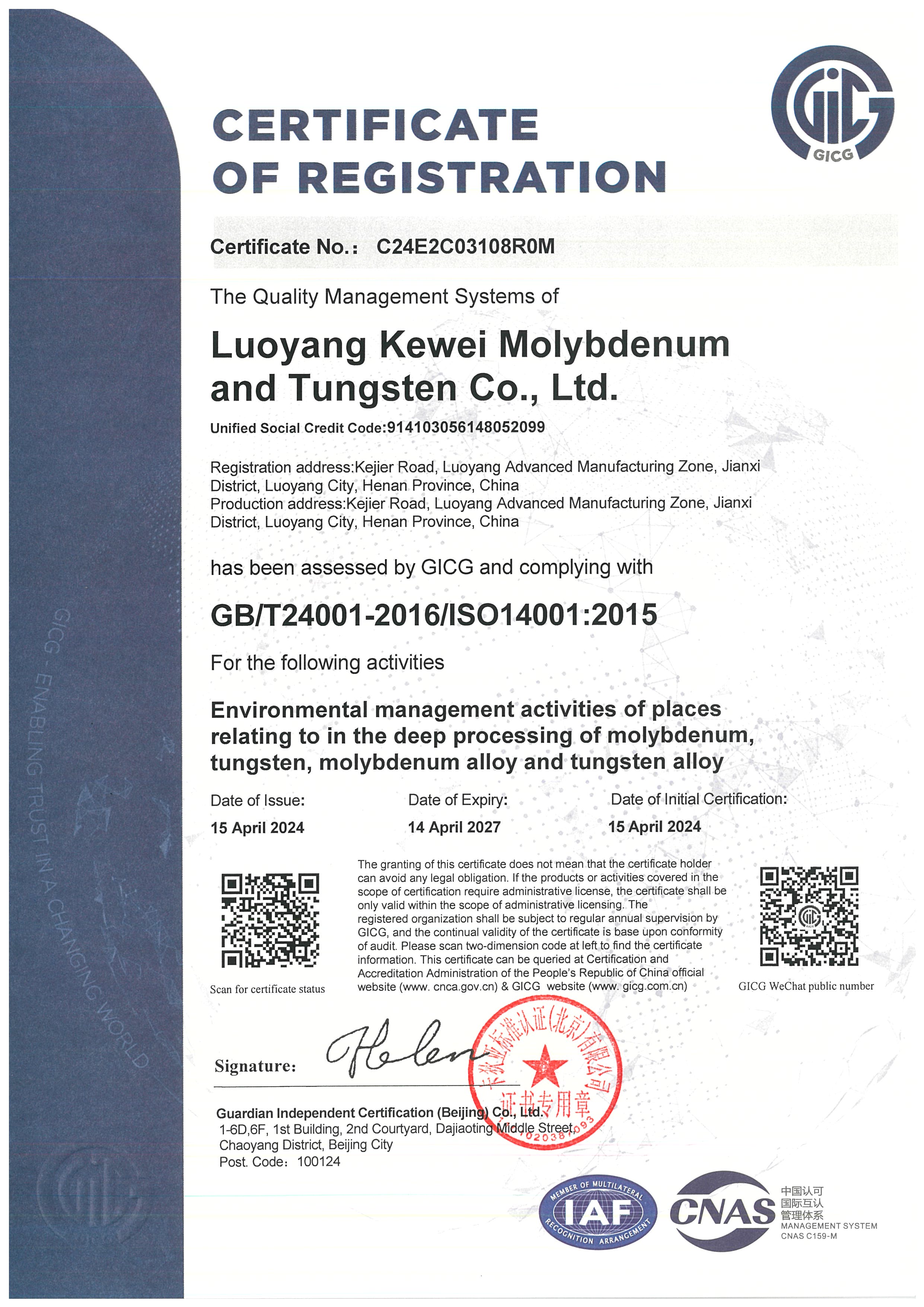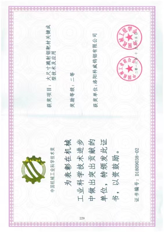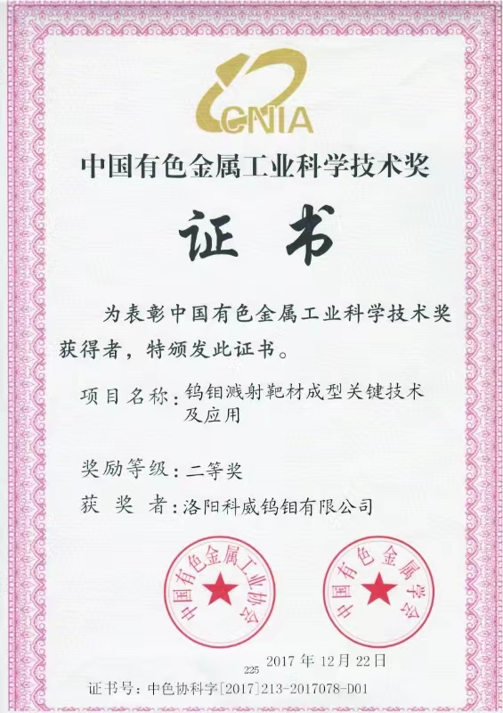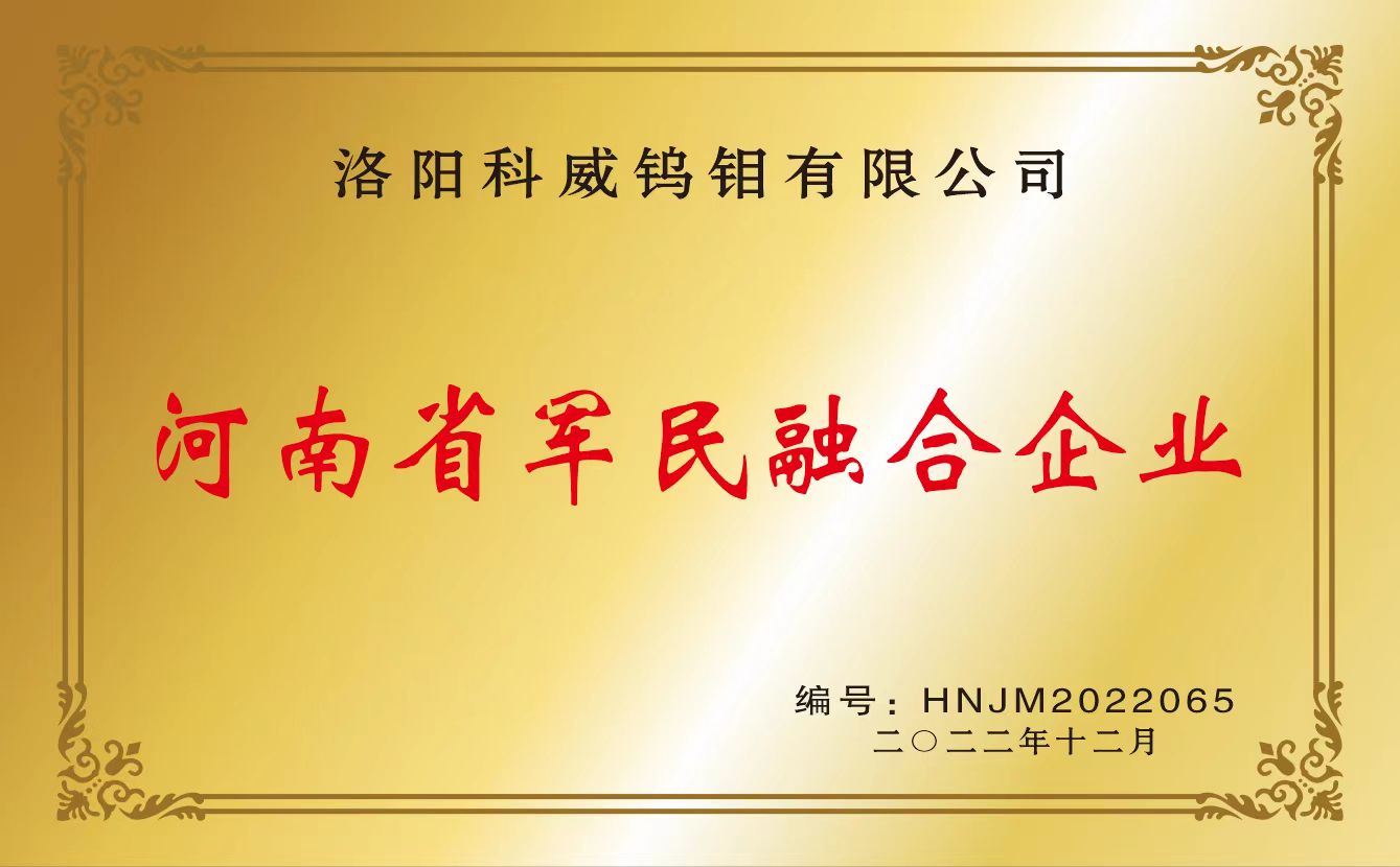 四、荣誉: “国家高新技术企业”, 国家专精特新重点“小巨人”企业, “国家科技型中小型企业”, “河南省钼及钼合金工程技术研究中心”, “有色金属省部共建协创中心理事单位”,“2025年河南省首批次新材料产品”,等。