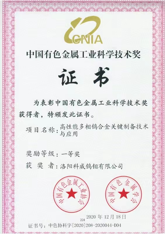 四、荣誉: “国家高新技术企业”, 国家专精特新重点“小巨人”企业, “国家科技型中小型企业”, “河南省钼及钼合金工程技术研究中心”, “有色金属省部共建协创中心理事单位”,“2025年河南省首批次新材料产品”,等。